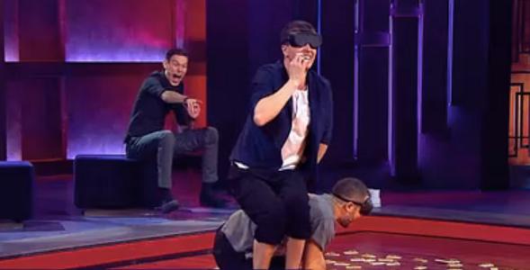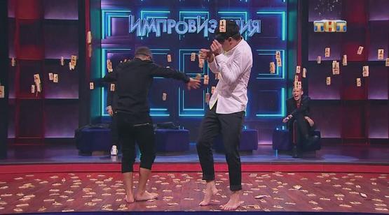 10.02.17 Дмитрий Позов в роли тренера, а Арсений Попов борец ученик. По ходу импровизации, Арсений всё время пытается увиливать и не идти по паркету с мышеловками, но Павел Воля и другие ребята этого не допустят.